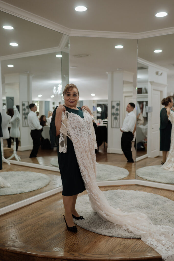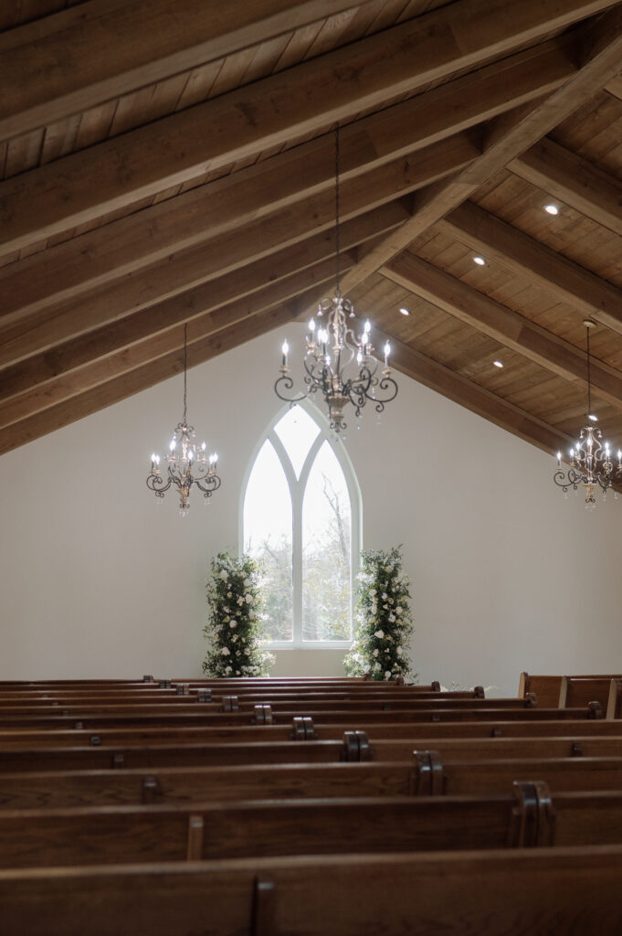 Their ceremony took place inside the chapel, surrounded by soft natural light and classic greenery framing the altar. The arched windows, warm wood beams, and neutral tones made for a clean, elevated ceremony space that photographs beautifully in any lighting condition. The reception followed in the grand indoor ballroom, complete with dramatic chandeliers and large windows overlooking the wooded property.