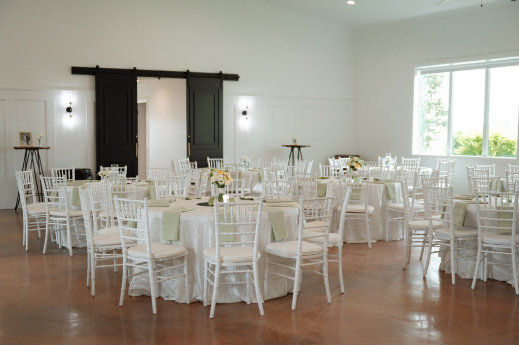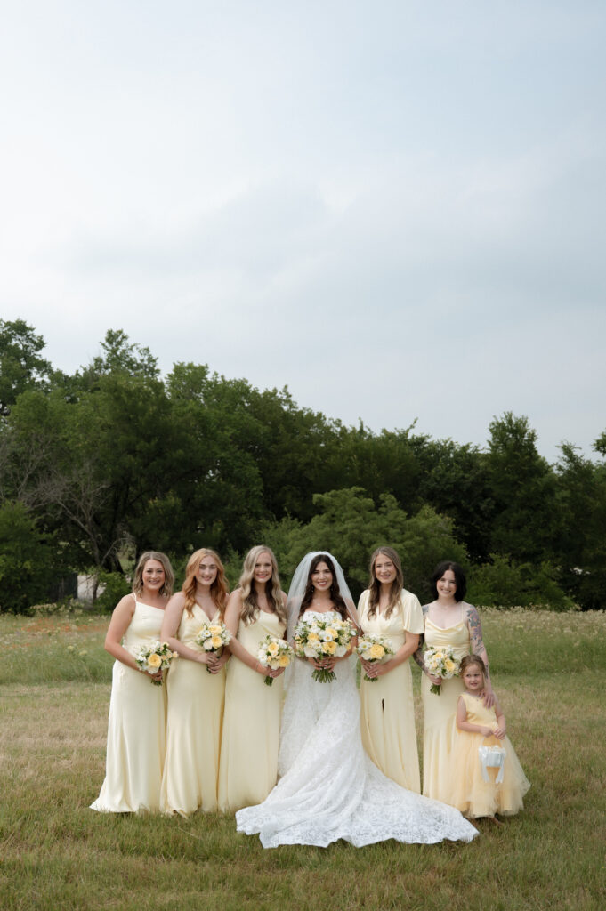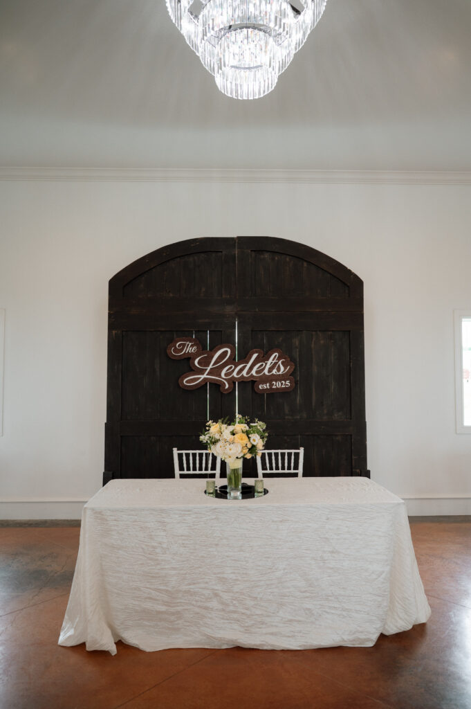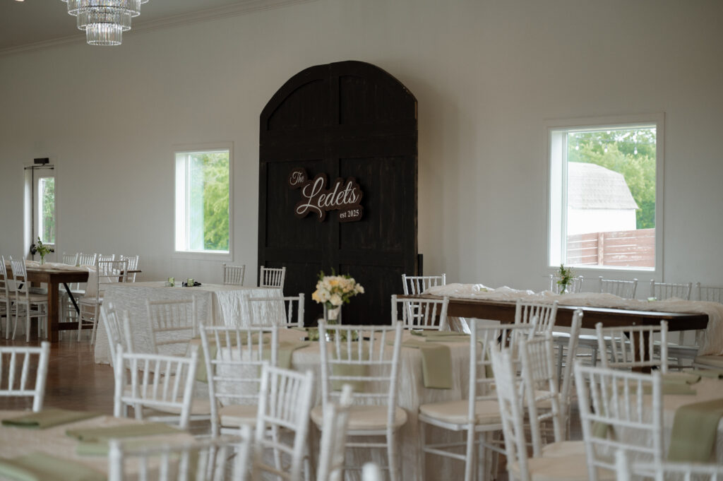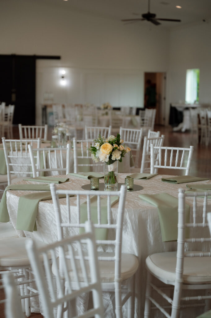 Olivia and Damon leaned fully into the season with a color palette of buttery yellow and soft green. It felt light, romantic, and effortlessly spring-forward—proof that a rustic wedding venue can still host a truly elegant wedding when styled intentionally.