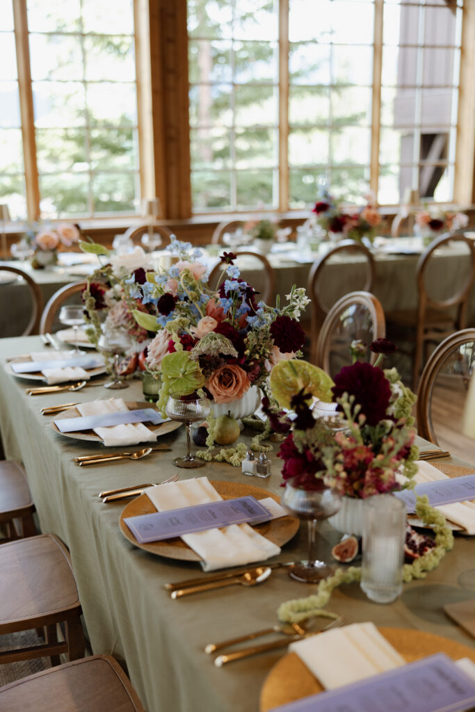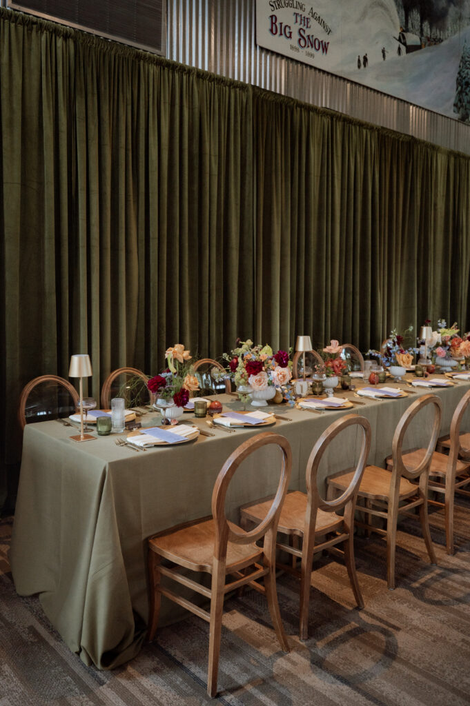 The details throughout the space were stunning. Lush florals by Lusha Events, beautiful linens from Luxe Linen, and thoughtful design elements that came to life from Thoughtfully Curated Events created an elegant atmosphere that still felt perfectly at home in the mountains.
