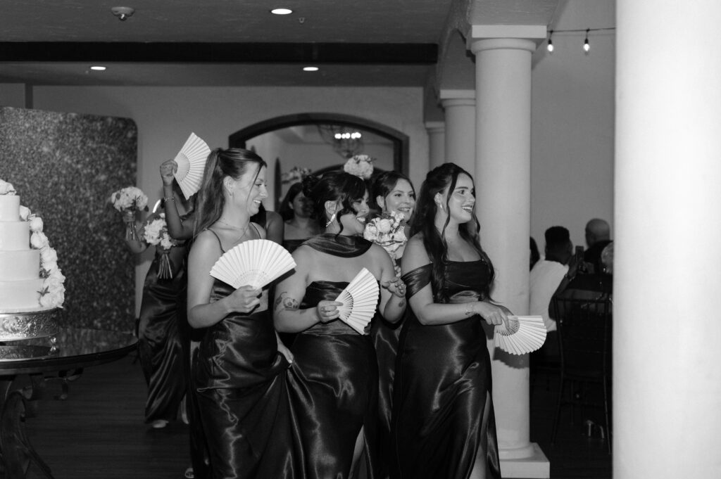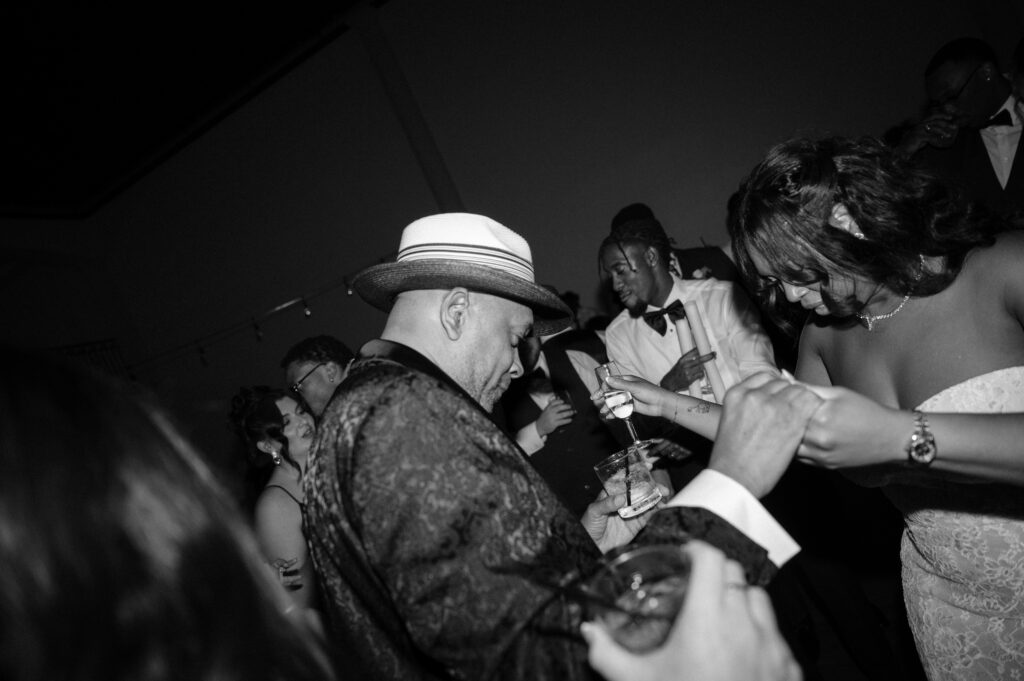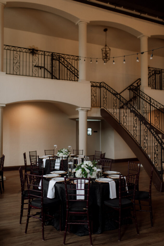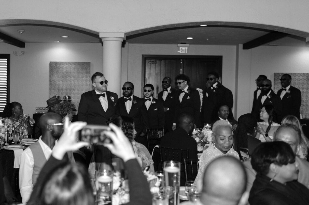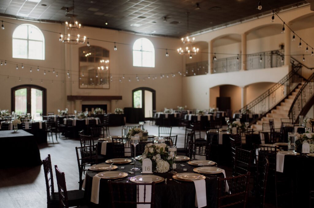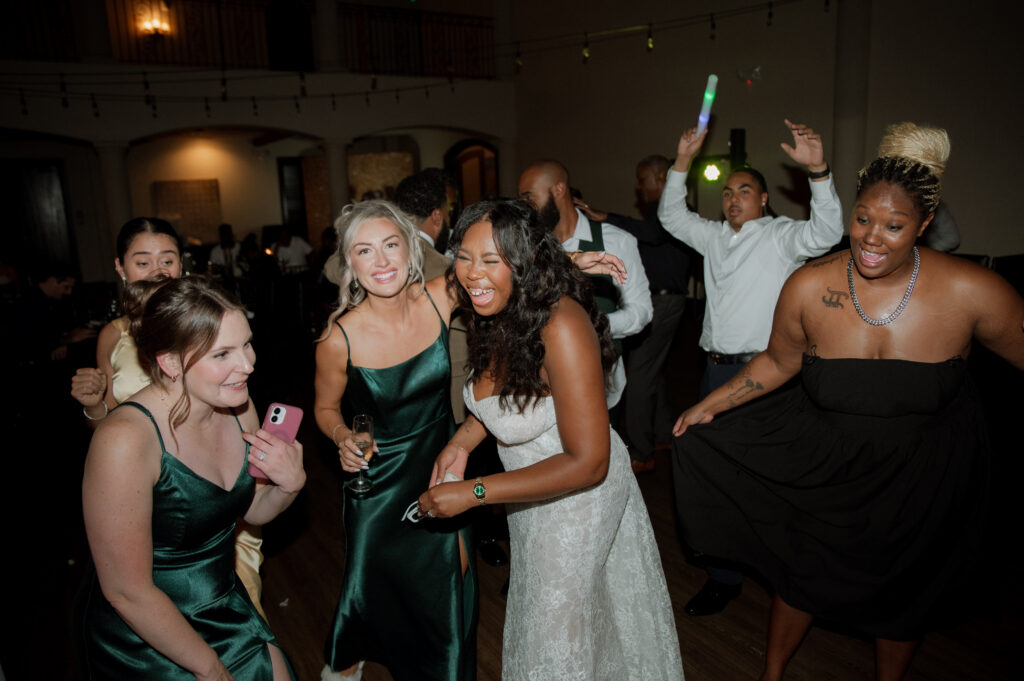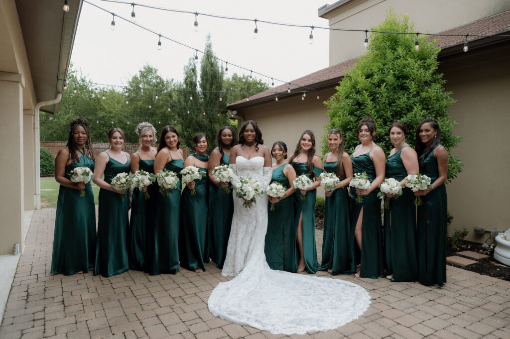 They leaned into a black, white, and green design that will never go out of style. Green bridesmaids dresses, green tuxes, black table linens, and soft white florals created that timeless look that is always beautiful. It was glamorous while being classic, and let the moments take center stage.